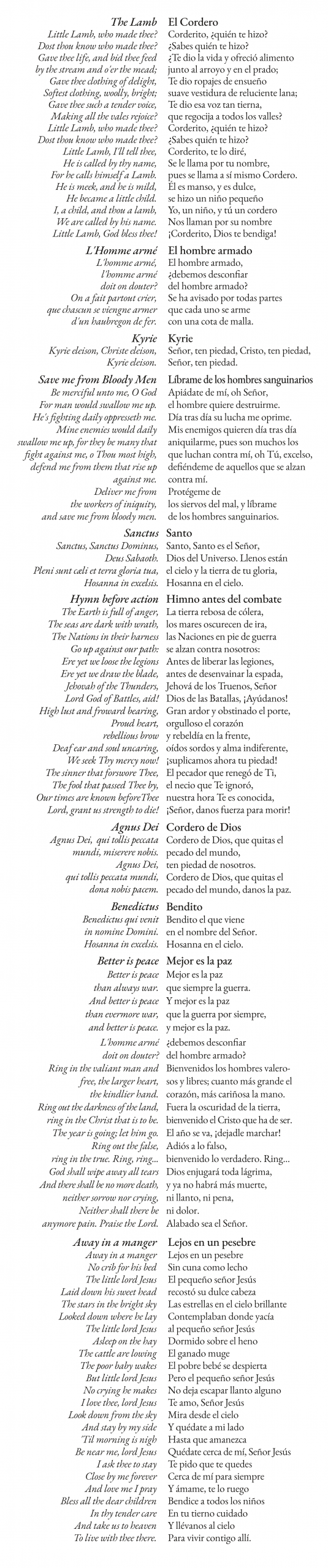 La continuación de la lucha interior de cada una de las almas participantes en el conflicto, y la necesidad de lo que Thomas Hobbes llamaría «el instinto de conservación de la propia especie», hace intercalar las plegarias al Altísimo –el Sanctus– con el Hymn Before Action o preparación a la batalla antes incluso de lo que sería natural en una misa ordinaria, en la que al Sanctus debería seguir el complementario Benedictus. Sin embargo, en una escalada dramática, las plegarias se mezclan con los cantos militares y toques de trompeta que bien podrían estar llamando a la batalla, a la oración, o entonando el toque de caídos. El desorden que muestra el miedo y el horror de la realidad bélica lleva al autor a anticipar el Agnus Dei –Cordero de Dios– incluso al Benedictus, haciendo aparecer a los contendientes como auténticos corderos que van a ser sacrificados en la batalla. Ello viene a enlazar con la primera de las obras que interpretaremos hoy, The Lamb, del también británico John Tavener, que presenta al Niño Jesús como el Cordero de Dios indefenso que viene a un mundo plagado de luchas para ser sacrificado.